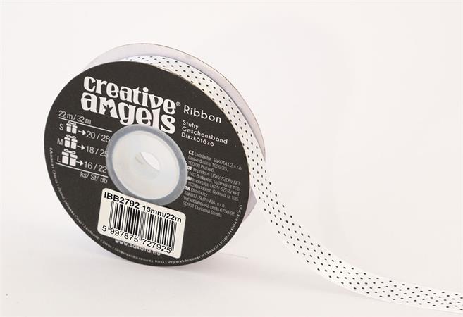 Saténová stuha, 15 mm x 22 m, biela s čiernymi bodkami