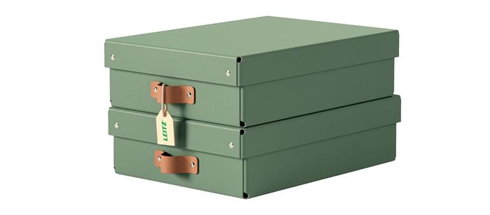 Štýlová kožená rukoväť uľahčuje vyberanie kartónových úložných boxov z políc, úložných či šatníkov.