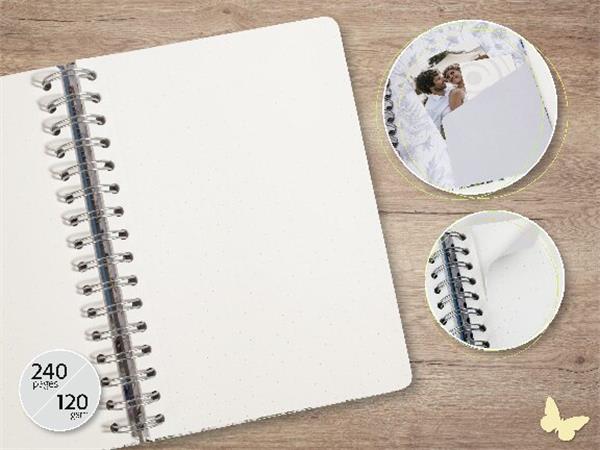 Špirálový zošit s tvrdou obálkou, s motívom Ginko -matný motív - špirálová väzba zlatej farby -mikroperforované listy -240 bodkovaných strán -100 g biely papier -vrecko na zadnej stane obalu -FSC certifikát -vegánsky produkt