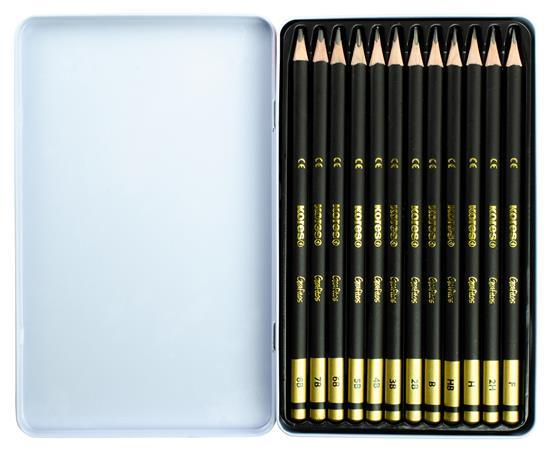 Grafitová ceruzka, sada, kovová škatuľa, trojhranná, KORES "GRAFITOS", 12 rôznych tvrdostí