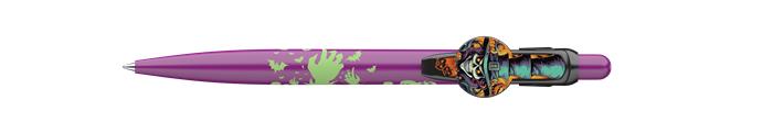 Guľôčkové pero, 0,8 mm, stláčací mechanizmus, fialové vzorované telo, ICO "Halloween", modré