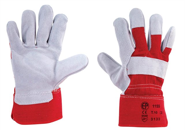 sivá, hovädzia štiepenková useň, chrbát a manžeta z červeného plátna, ochrana žíl, nechtov a pästných kostí, farba: červená/sivá, hrúbka: 1,2 mm