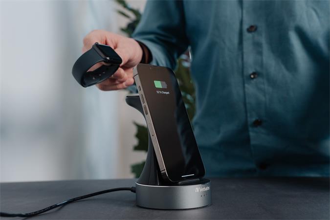 Bezdrôtová nabíjacia stanica Verbatim poskytuje bezdrôtové nabíjanie pre vaše zariadenia Apple počas spánku. Stačí umiestniť každé zariadenie na určené miesto a nabíjanie sa začne pri kontakte. Nabíjajte hodinky Apple Watch a iPhone (8 alebo novší) alebo iné bezdrôtové nabíjacie zariadenia s certifikáciou Qi pomocou nabíjacej stanice 2 v 1 od Verbatimu. -2 v 1: pre Apple Watch a iPhone (8 alebo novší) alebo iné bezdrôtové nabíjacie zariadenie s certifikáciou Qi -vstavaný magnetický nabíjací modul Apple Watch: kompatibilný so všetkými sériami Apple Watch vrátane 7, 8 a Ultra; 5V/1A pre Apple Watch (vyrobené s certifikátom Apple Watch) - nie je potrebné odstraňovať puzdro na telefón, pretože nabíjacia plocha dokáže nabiť vo väčšine prípadov až do hrúbky 3 mm - plný výkon: max. 20W (Apple Watch: 5W, bezdrôtové nabíjanie: max. 15W) - funkcie nabíjania sú chránené proti nadprúdu a prepätiu - certifikácia MFi - certifikácia Qi - kompaktný dizajn - hliníková základňa - 1,5 m kábel - súčasťou balenia sieťový adaptér: So zástrčkou pre EÚ a Spojené kráľovstvo - napájanie: 9V/3A 27W - veľkosť nabíjacieho tela: 116,5 x 89 x 130 mm - automaticky rozpozná prítomnosť a odstránenie predmetov - detekcia cudzích predmetov - záruka 2 roky
