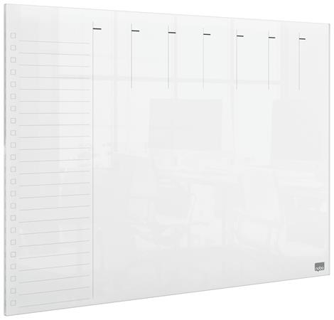 Tento týždenný plánovač do domácej kancelárie je vďaka svojmu modernému bezrámovému dizajnu a týždennej mriežke ideálny na zapisovanie poznámok, myšlienok, nápadov a dôležitých dátumov. Vďaka samolepiacim podložkám a magnetom ho možno použiť ako nástennú tabuľu, keď sa pripevní na kovový povrch, alebo ako tabuľu, keď sa položí na stôl alebo inú pracovnú plochu. Vďaka priehľadnému dizajnu pripomienková tabuľa splynie s okolím, keď sa nepoužíva. Jej povrch so suchou gumou sa ľahko udržiava v čistote, stačí na ňu písať, utrieť ju a začať znova. Súčasťou balenia je: 1 pero na bielu tabuľu. Veľkosť: A3.